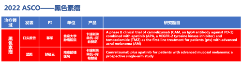 黑色素瘤领域的2篇研究摘要,采用恒瑞医药自主研发的PD-1抑制剂卡瑞利珠单抗(艾瑞卡)联合阿帕替尼(艾坦)(“双艾”组合)的免疫联合抗血管(或再联合化疗)的治疗策略。
