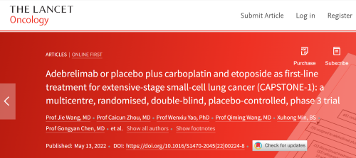 北京时间2022年5月14日,恒瑞医药自主研发的PD-L1抑制剂阿得贝利单抗治疗广泛期小细胞肺癌的III期临床研究(CAPSTONE-1研究)成果正式全文在线发表于国际权威学术期刊《柳叶刀·肿瘤学》(《THE LANCET Oncology》,影响因子41.316)。CAPSTONE-1研究结果显示,阿得贝利单抗联合化疗一线治疗广泛期小细胞肺癌相较于安慰剂联合化疗可以显著延长患者总生存期至15.3个月[1],刷新现有免疫药物一线治疗广泛期小细胞肺癌的总生存纪录[2]。