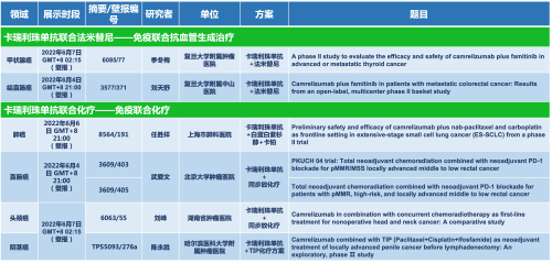 卡瑞利珠单抗联合恒瑞医药的另一款创新药法米替尼在甲状腺癌和结直肠癌领域有2项研究被接收为壁报,另有卡瑞利珠单抗联合化疗的4项研究在肺癌、结直肠癌、头颈癌和阴茎癌领域的研究被接收为5份壁报。
