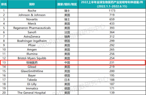 近日,全球专利数据库incoPat创新指数研究中心发布全球生物医药发明专利TOP100榜单,恒瑞医药以上半年231件发明专利申请量位列榜单第13名,是唯一一家进入TOP20的中国药企。