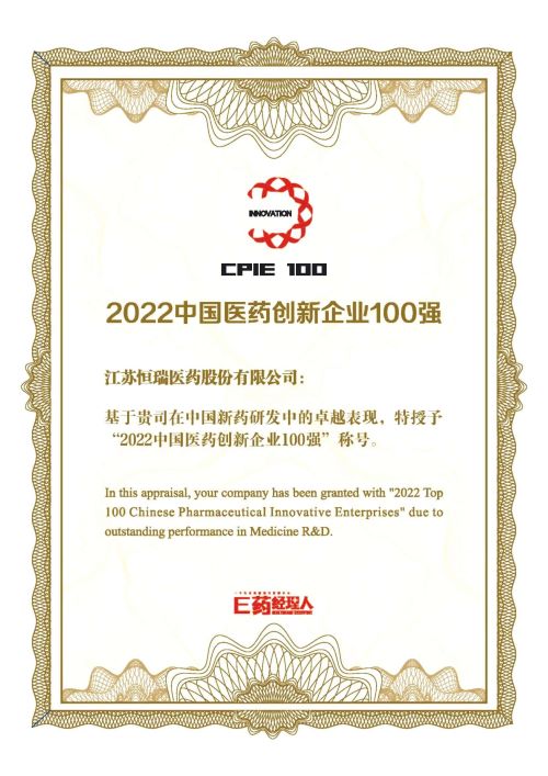 近日,知名医药行业媒体《E药经理人》发布2022“中国医药创新企业100强”榜单,恒瑞医药以卓越的创新研发实力连续第四年上榜并位列第一梯级。同时,在《E药经理人》首次评选的“中国医药创新升级榜样50”榜单中,公司也位列第二。