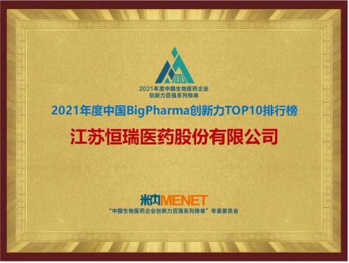 9月16日,由米内网主办的“2021年度中国生物医药企业创新力百强系列榜单”发布会在线上举办。恒瑞医药继去年登顶“中国BigPharma企业创新力TOP10排行榜”后,今年再次名列该榜单首位。