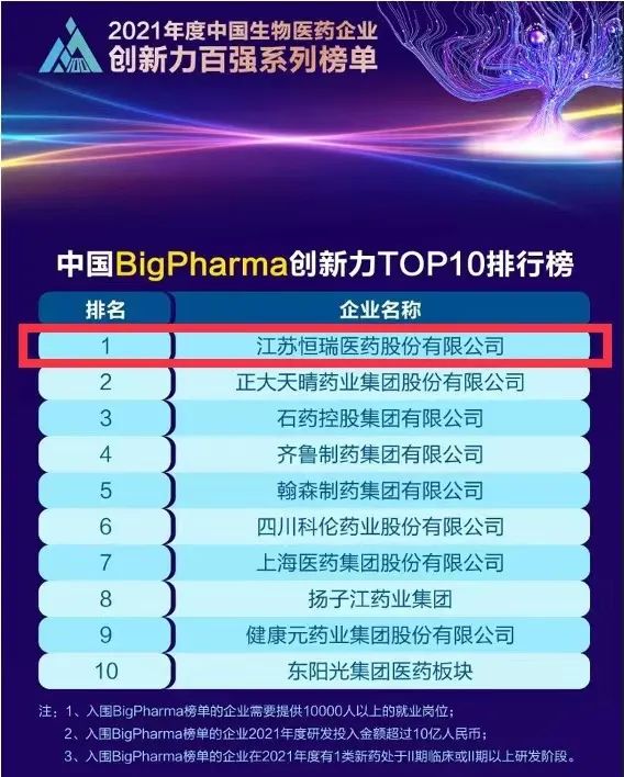 蝉联榜首!恒瑞医药再次登顶“中国BigPharma企业创新力TOP10排行榜”