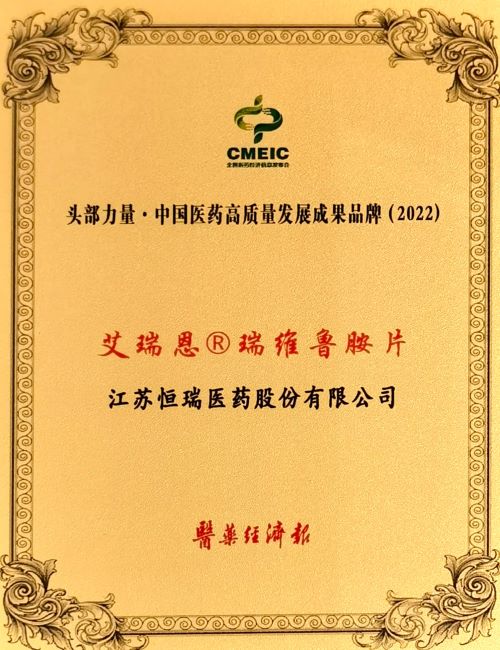 2月19日,由国家药品监督管理局南方医药经济研究所指导、医药经济报主办的第34届全国医药经济信息发布会在珠海举行。当晚,大会发布了2022年度头部力量·中国医药高质量发展成果企业和品牌,恒瑞医药再次蝉联“头部力量·中国医药高质量发展成果企业”,公司创新药艾瑞恩®(瑞维鲁胺片)荣膺“头部力量·中国医药高质量发展成果品牌(2022)”。