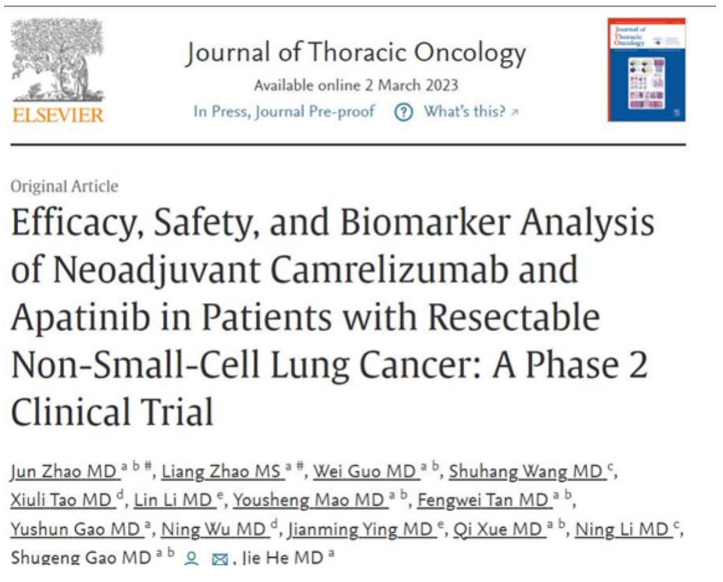 [1] ZHAO J, ZHAO L, WEI G, et al. Efficacy, Safety, and Biomarker Analysis of Neoadjuvant Camrelizumab and Apatinib in Patients with Resectable Non-Small-Cell Lung Cancer: A Phase 2 Clinical Trial. J Thorac Oncol. doi: //doi.org/10.1016/j.jtho.2023.02.019