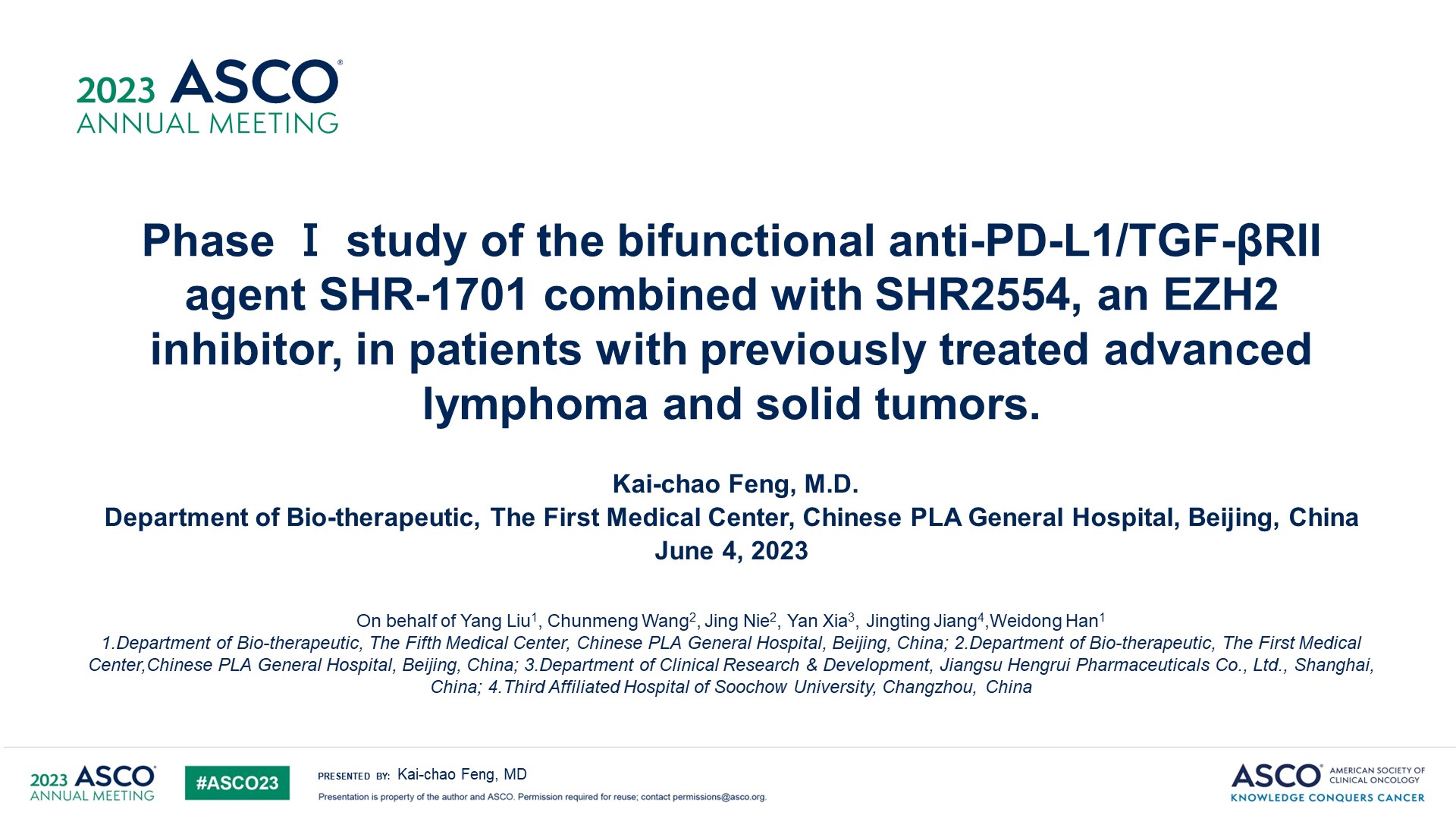 双功能抗PD-L1/TGF-βRII药物SHR-1701联合EZH2抑制剂SHR2554治疗经治的晚期淋巴瘤和实体瘤患者Ⅰ期研究结果在ASCO 2023会上发布