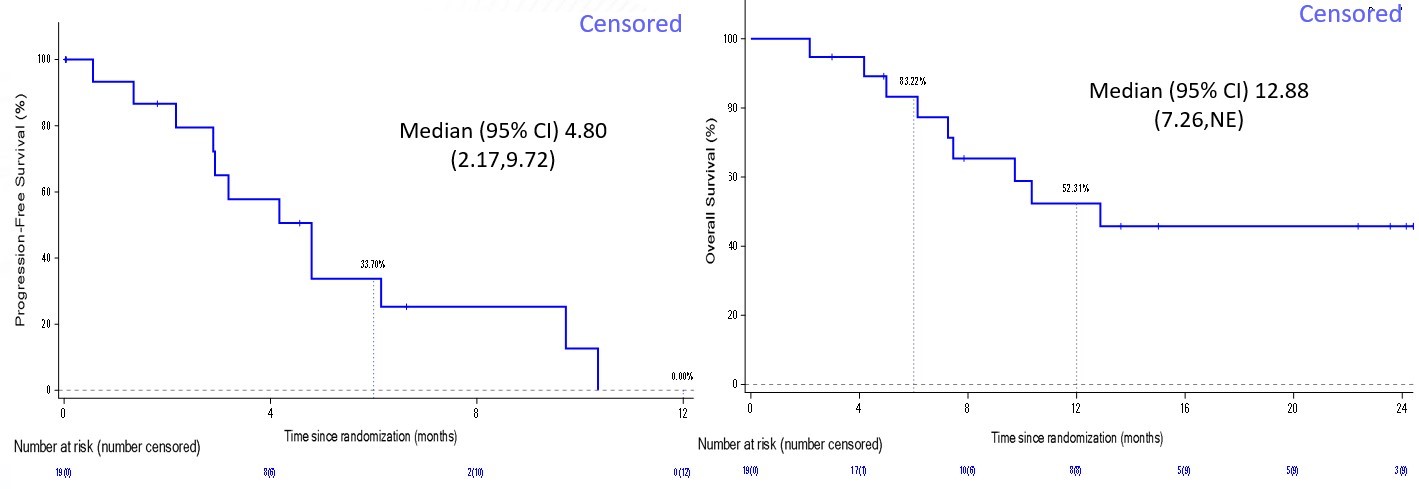 2020年10月至2023年8月,共入组19例患者,其中15例为GBM。中位随访时间达到22.37个月。中位PFS为4.80个月(95% CI:2.17–9.72),中位OS为12.88个月(95% CI :7.26–NE)。6个月PFS率为33.70%,6个月OS率为83.22%。12个月OS率为52.31%。