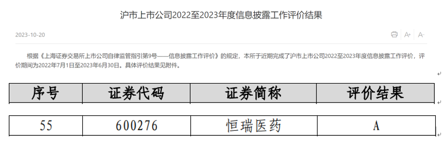 近日,上海证券交易所公布了沪市上市公司2022-2023年度信息披露工作评价结果,凭借在信息披露、规范运作以及投资者关系管理等方面的优秀表现,恒瑞医药获评A级。本次共有2160家沪市上市公司参评(包括499家科创板上市公司),评价等级从高到低依次为A、B、C、D四类,获得A类评价的上市公司占比约18.5%。