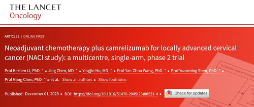 [1] Kezhen Li, Jing Chen, Yingjie Hu, Yan-Zhou Wang, Yuanming Shen, Gang Chen,Jihui Ai, Ding Ma,Chaoyang Sun,et al.Neoadjuvant chemotherapy plus camrelizumab for locally advanced cervical cancer (NACI study): a multicentre, single-arm, phase 2 trial.Lancet Oncol. Published:December 01,2023. DOI://doi.org/10.1016/S1470-2045(23)00531-4