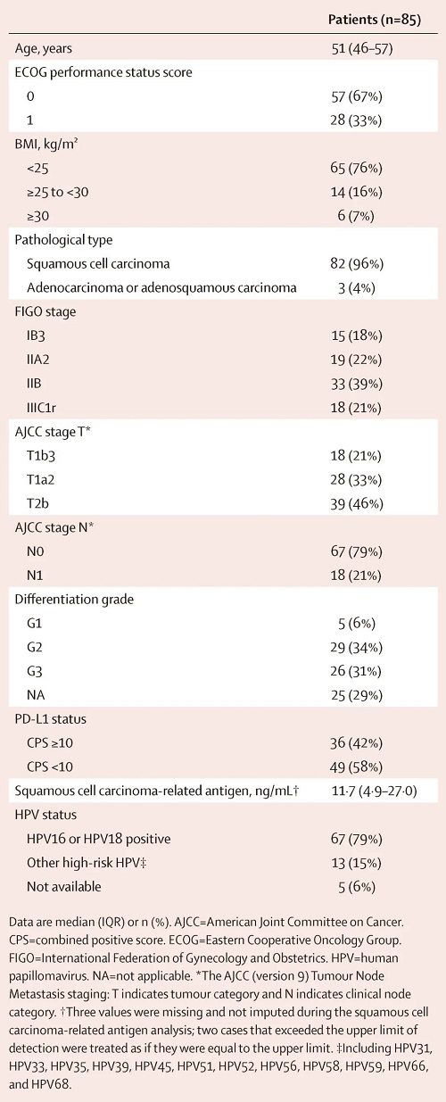 自2020年12月1日至2023年2月10日,共筛选117例患者,纳入85例,并接受至少一次卡瑞利珠单抗治疗。其中,82例为鳞癌,36例CPS ≥10,67例感染HPV16/HPV18(表1)。