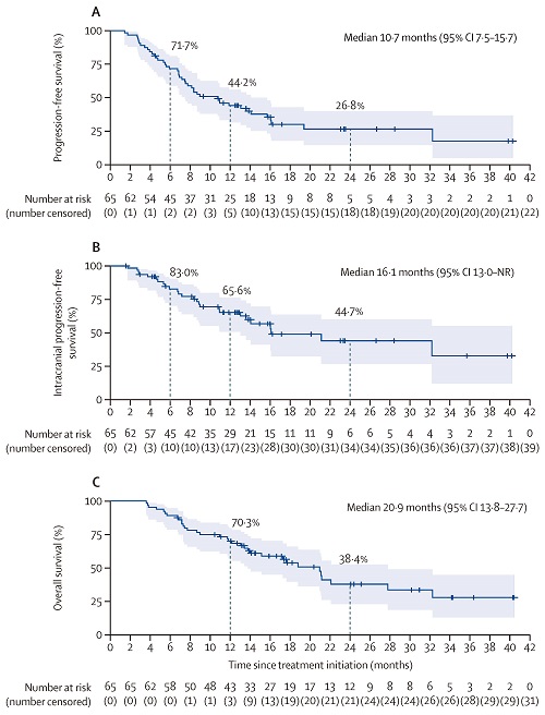 在FAS中,iORR为78.5%(95% CI:66.5%-87.7%),颅内疾病控制率(iDCR)为98.5%(95% CI:91.7%-100%),颅外病灶的ORR为69.2%(95% CI:56.6%-80.1%),DCR为93.8%(95% CI:85.0%-98.3%);