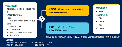 达尔西利(Dalpiciclib)是恒瑞医药自主研发的口服、选择性的小分子CDK4/6抑制剂,也是中国首个自主研发的新型高选择性 CDK4/6 抑制剂,已证实其与内分泌治疗(ET)联合用于 HR+/HER2- 晚期乳腺癌的一线和后线治疗时,均显著改善无进展生存期(PFS)6,7。因此开展了一项随机、双盲、III期临床试验(DAWNA-A),以进一步评估达尔西利联合内分泌治疗作为高危早期 HR+/HER2 - 乳腺癌辅助治疗的效果。本研究纳入高危复发风险人群需满足以下标准之一:①≥4 枚阳性腋窝淋巴结;②1–3枚阳性腋窝淋巴结且合并≥1 项高危因素(肿瘤直径 ≥5 cm,组织学分级3级,辅助治疗后残留浸润性乳腺癌,Ki-67 ≥30%)。本文呈现预先设定的首次中期分析(IA1)结果。