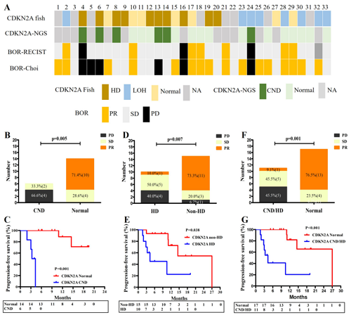 探索性研究发现,CDKN2A基因突变与脊索瘤患者的不良预后相关。研究结果显示,CDKN2A拷贝数缺失(CND)是一个重要的生物标志物。通过对脊索瘤标本进行CDKN2A荧光原位杂交(FISH)检测及进一步验证,这些基因改变的患者疾病进展率高于未改变的患者,且PFS缩短。这一结果提示未来CDKN2A可能在指导脊索瘤个体化治疗起到积极作用。