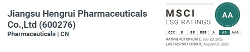 喜讯!恒瑞医药荣获MSCI ESG“AA”评级