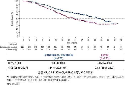 本研究的主要终点分析显示,卡瑞利珠单抗-法米替尼治疗组较化疗组显著延长了PFS和OS。卡瑞利珠单抗-法米替尼治疗组 vs 化疗组经BICR评估的中位PFS为11.1个月 vs 7.5个月(HR=0.68,95% CI:0.53-0.86,P=0.0007)(图2),中位OS是34.4个月 vs 23.4个月(HR=0.65,95% CI:0.49-0.86,P=0.0012)(图3)。